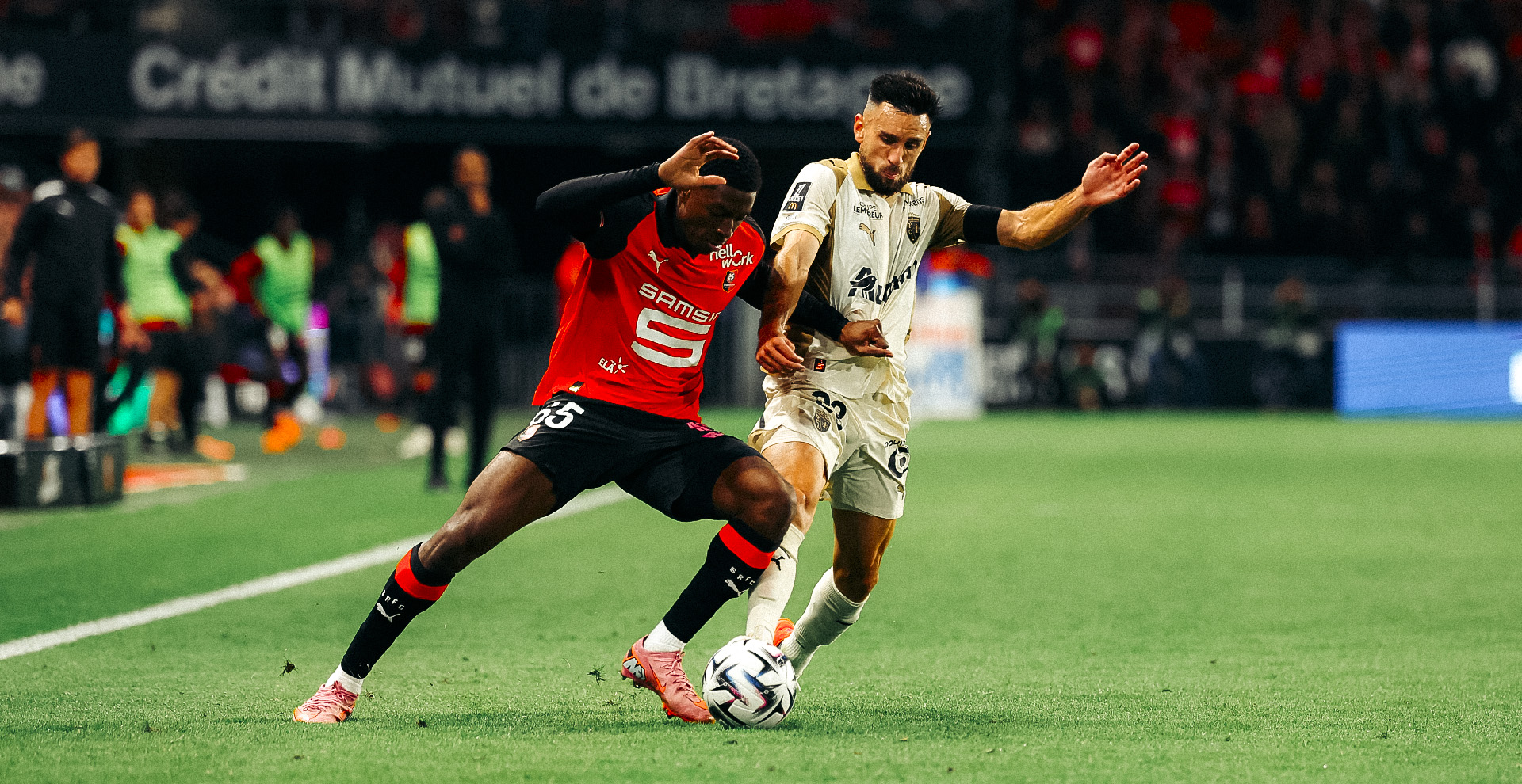 La deuxième période est lancée et ce sont les Rennais qui remettent le pied sur le cuir. Soudés et parfaitement en place, les Sang et Or font le dos rond et évoluent en contre. Justes techniquement dans la ressortie de balle, Odsonne Édouard et Wesley Saïd trouvent Matthieu Udol avec un relais de Florian Thauvin, mais le repli défensif breton est efficace (55’). La rencontre s’enflamme ! Sur un centre venu de la droite, le capitaine Adrien Thomasson reprend de la tête mais sa reprise heurte le poteau gauche. Dans la continuité de l’action, Samson Baidoo réussit un excellent retour sur Esteban Lepaul (59’).