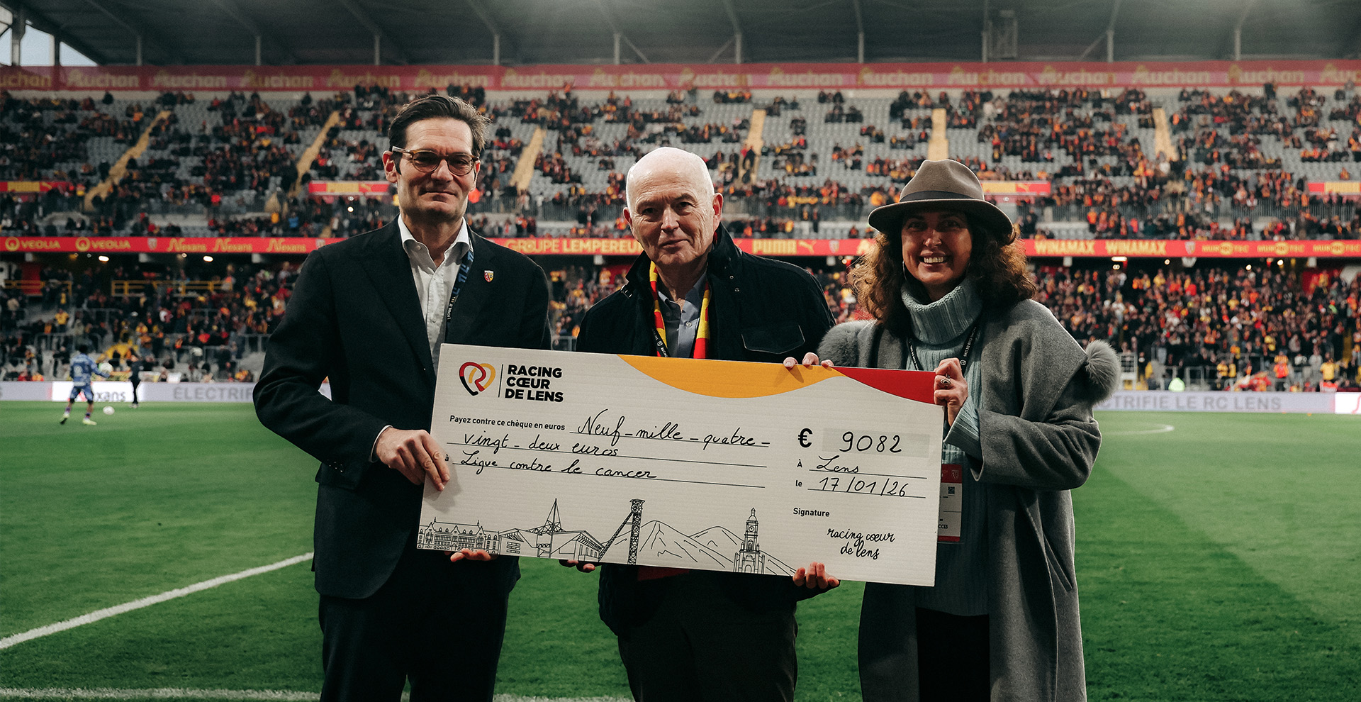 Une action, désormais tradition ! Pour la cinquième saison consécutive, l'équipe féminine du Racing s'est engagée pour « Octobre Rose », campagne annuelle visant à sensibiliser la population au dépistage du cancer du sein et à récolter des fonds, notamment pour la recherche. Ainsi, les joueuses de Sarah M’Barek ont porté pendant plusieurs semaines une tunique rose, symbole de lutte et de solidarité, qui a ensuite été vendue aux enchères au profit de la Ligue contre le Cancer. Avant la réception de l'AJ Auxerre à Bollaert-Delelis, lors de la 18e journée de Ligue 1 McDonald's, le Président Joseph Oughourlian et la Présidente de la section féminine Andreea Koenig ont remis un chèque à Bernard-Marie Dupont, président du comité du Pas-de-Calais.